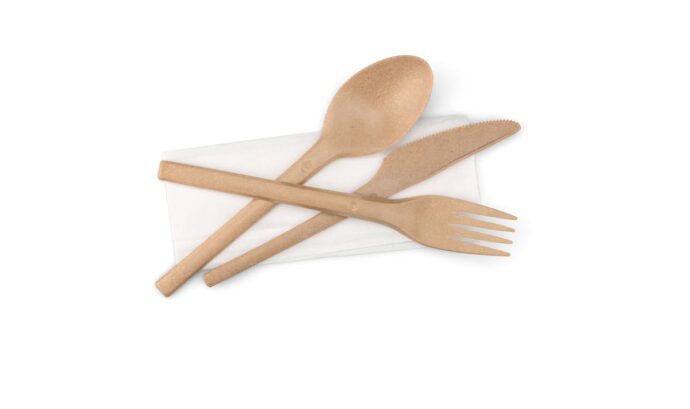 Refork wegwerp bestekset bestaande uit een mes, lepel, vork en wit servet, verpakt in papieren zakje